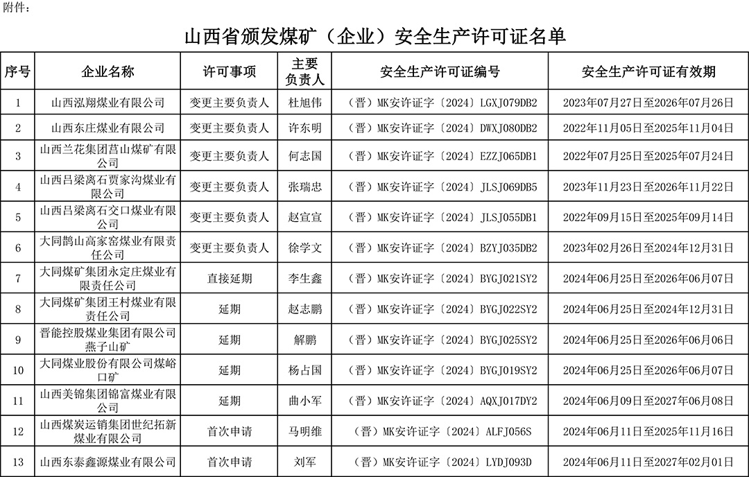 山西省應(yīng)急管理廳關(guān)于頒發(fā)煤礦(企業(yè))安全生產(chǎn)許可證的公告經(jīng)研究,按照有關(guān)規(guī)定,為山西泓翔煤業(yè)有限公司等13座煤礦(企業(yè))頒發(fā)安全生產(chǎn)許可證,現(xiàn)進(jìn)行公告。公告期:2024 年 6 月 12 日至2024 年6 月18 日。2024 年6 月11 日
