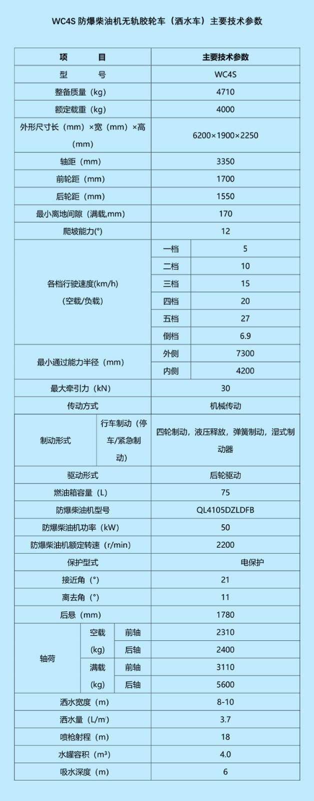 根據(jù)煤礦井下特殊環(huán)境為改善井下工作環(huán)境保護工作人員健康而研發(fā)防爆柴油機膠輪灑水車。機車底盤由躍進汽車股份有限公司提供整車性能得到保障。動力采用我公司研發(fā)的國三防爆高效環(huán)保發(fā)動機配置全液壓濕式制動,制動穩(wěn)定。