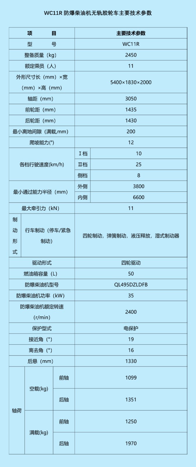 - 產(chǎn)品名稱:W11R防爆柴油機(jī)無軌膠輪指揮車
