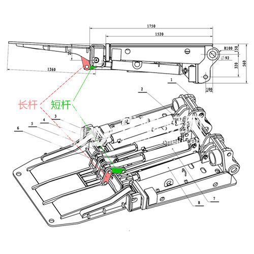 液壓支架中長桿、短桿與護(hù)幫板和護(hù)幫千斤頂組成小四連桿機(jī)構(gòu),從而實(shí)現(xiàn)護(hù)幫板與前梁(頂梁)的鉸接。