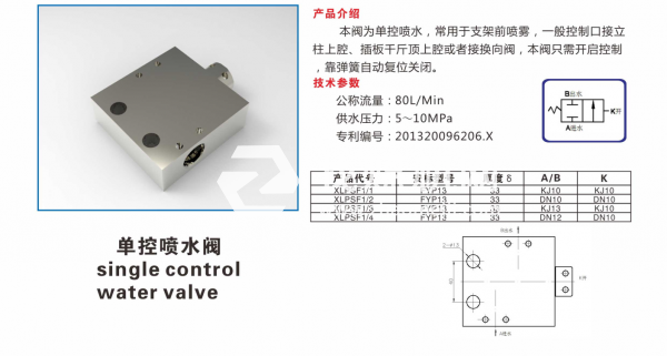 本閥為單控噴水,常用于支架前噴霧,一般控制口接立柱上腔、插板千斤頂上腔或者接換向閥,本閥只需開啟控制靠彈簧自動復(fù)位關(guān)閉。