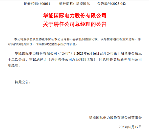 2、6月16日,華能國際第十屆董事會第三十二次會議,審議通過了《關(guān)于聘任公司總經(jīng)理的議案》,同意聘任黃歷新先生為公司總經(jīng)理。