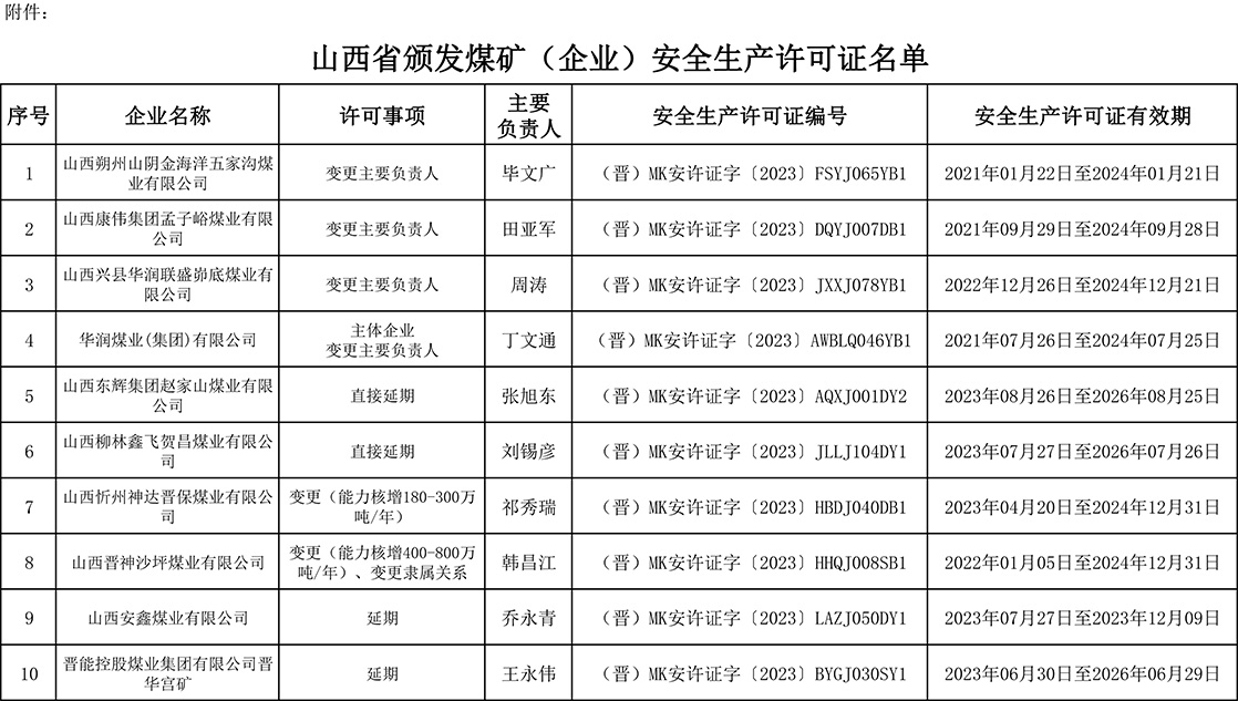 山西省應(yīng)急管理廳關(guān)于頒發(fā)煤礦(企業(yè))安全生產(chǎn)許可證的公告根據(jù)有關(guān)規(guī)定,經(jīng)煤礦安全生產(chǎn)許可事項(xiàng)聯(lián)席會(huì)議研究決定,為山西朔州山陰金海洋五家溝煤業(yè)有限公司等 10 座煤礦(企業(yè))頒發(fā)安全生產(chǎn)許可證,現(xiàn)進(jìn)行公告。公告期:2023 年 7 月11 日至2023 年7 月17日。2023 年7 月10日