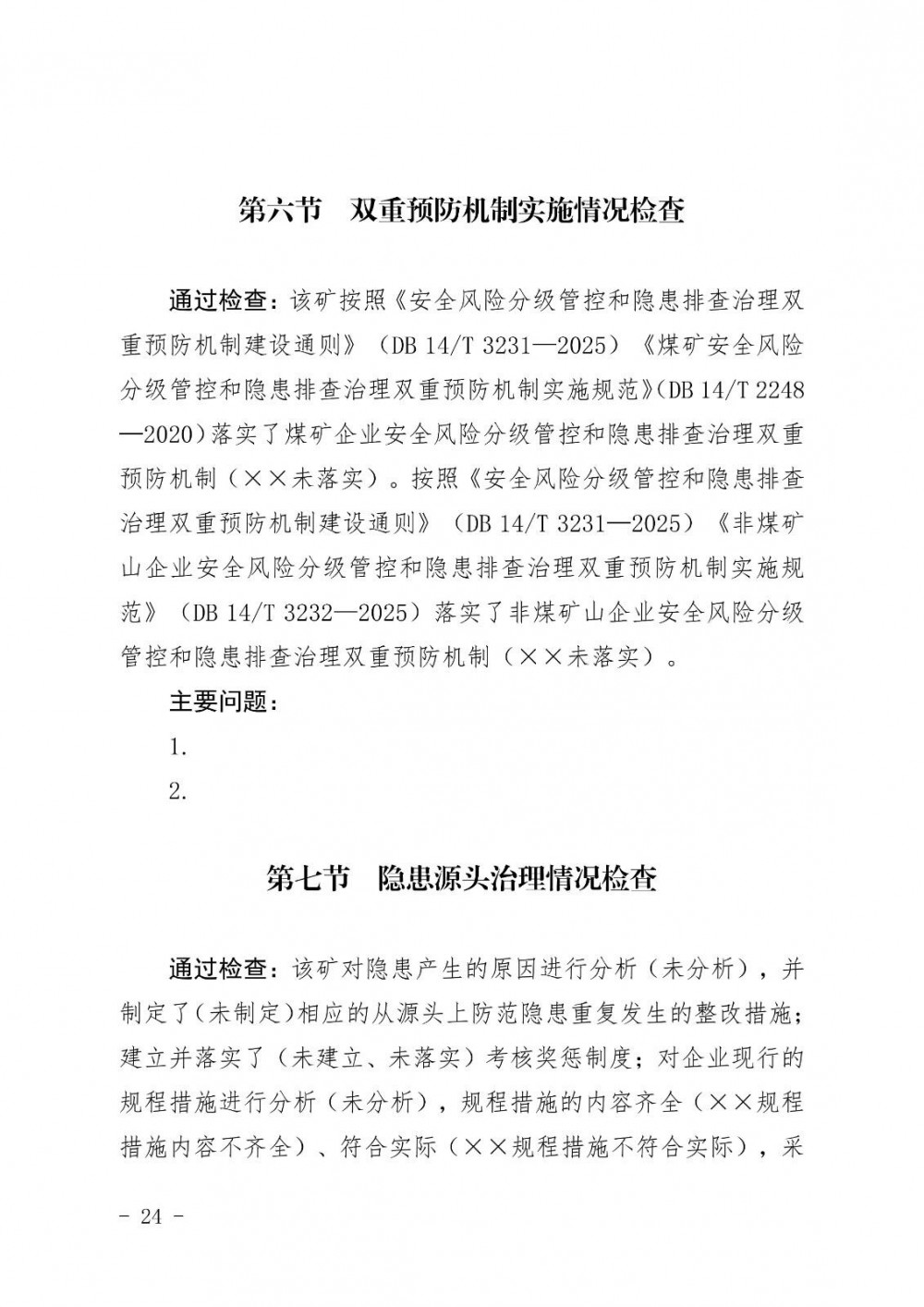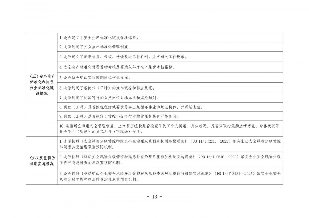 是否按照《安全風(fēng)險分級管控和隱患排查治理雙重預(yù)防機制建設(shè)通則》(DB 14/T 3231—2025)《煤礦安全風(fēng)險分級管控和隱患排查治理雙重預(yù)防機制實施規(guī)范》(DB 14/T 2248—2020)《非煤礦山企業(yè)安全風(fēng)險分級管控和隱患排查治理雙重預(yù)防機制實施規(guī)范》(DB 14/T 3232—2025)落實企業(yè)安全風(fēng)險分級管控和隱患排查治理雙重預(yù)防機制。
