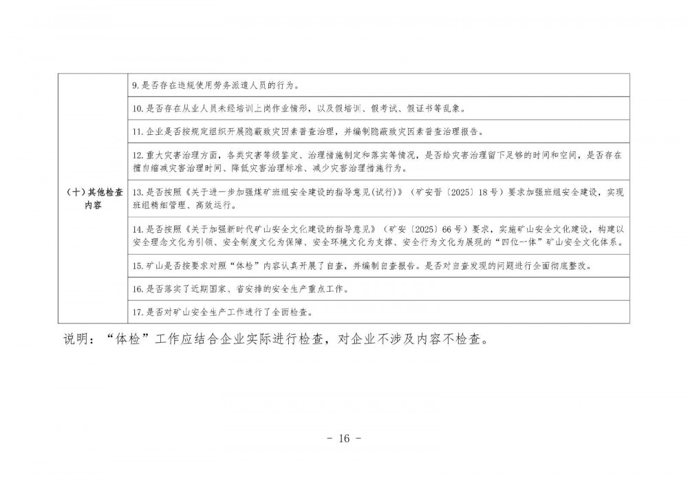 礦山是否按批準(zhǔn)的安全設(shè)施設(shè)計進行建設(shè);礦山安全設(shè)施重大變更是否按規(guī)定履行了審批手續(xù)。礦山安全生產(chǎn)各大系統(tǒng)是否可靠運行;高瓦斯和煤與瓦斯突出礦井采煤工作面動力電源與礦井主通風(fēng)機是否實現(xiàn)風(fēng)電閉鎖;是否使用國家和我省明令禁止使用或者淘汰的技術(shù)、工藝、材料和設(shè)備;煤礦是否按采掘紅線批準(zhǔn)范圍進行采掘活動;礦山重要作業(yè)場所是否實現(xiàn)全過程視頻監(jiān)控并有效運行;煤礦井下危險作業(yè)區(qū)域是否安設(shè)了“電子圍欄”。是否存在違規(guī)使用勞務(wù)派遣人員的行為;是否存在從業(yè)人員未經(jīng)培訓(xùn)上崗作業(yè)情形,以及假培訓(xùn)、假考試、假證書等亂象。企業(yè)是否按規(guī)定組織開展隱蔽致災(zāi)因素普查治理,并編制隱蔽致災(zāi)因素普查治理報告。重大災(zāi)害治理方面,各類災(zāi)害等級鑒定、治理措施制定和落實等情況,是否給災(zāi)害治理留下足夠的時間和空間,是否存在擅自縮減災(zāi)害治理時間、降低災(zāi)害治理標(biāo)準(zhǔn)、減少災(zāi)害治理措施行為;是否按照《關(guān)于進一步加強煤礦班組安全建設(shè)的指導(dǎo)意見(試行)》(礦安晉〔2025〕18 號)要求加強班組安全建設(shè),實現(xiàn)班組精細(xì)管理、高效運行。是否按照《關(guān)于加強新時代礦山安全文化建設(shè)的指導(dǎo)意見》(礦安〔2025〕66 號)要求,實施礦山安全文化建設(shè),構(gòu)建以安全理念文化為引領(lǐng)、安全制度文化為保障、安全環(huán)境文化為支撐、安全行為文化為展現(xiàn)