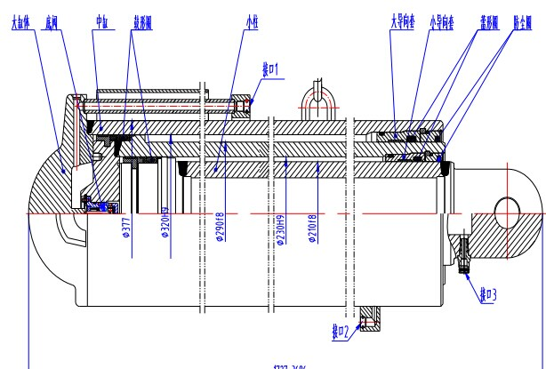 外缸的結(jié)構(gòu)和作用與單伸縮立柱的缸體基本相同。中缸由中缸底(也叫柱塞,它即是缸底也是活塞。)和中缸體連接而成,其即是外缸的活柱,又是二級(jí)缸的缸體。其可在外缸中上下運(yùn)動(dòng),為液壓缸中的主要傳力部件。其缸底部裝有活塞導(dǎo)向環(huán)、活寒密封形成與外缸的密封和導(dǎo)向。中缸內(nèi)部裝有底閥,以控制活柱的升降。中缸的外表面為先鍍錫青銅(或白鉻)再鍍硬鉻的雙層復(fù)合鍍層,以防止磨損和銹蝕。其上部通過(guò)導(dǎo)向套與外缸相連,形成密封和導(dǎo)向?;钪挥谥懈變?nèi),可在中缸內(nèi)上下運(yùn)動(dòng),為液壓缸的主要傳力部件。其結(jié)構(gòu)、作用與單伸縮立柱的活柱相同,其柱頭部加工有進(jìn)液孔,該進(jìn)液孔通過(guò)活柱中間深孔與二級(jí)缸的環(huán)形腔相通。